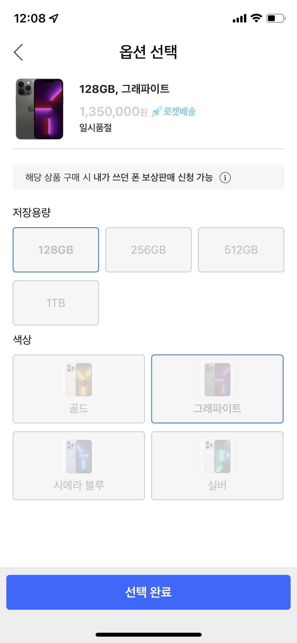 구입을 완료하고 다시 구입화면으로 돌아가보니, iPhone 13 Pro 같은 경우에는 전 스펙이 모두 품절로 나오는 것을 확인할 수 있었습니다.