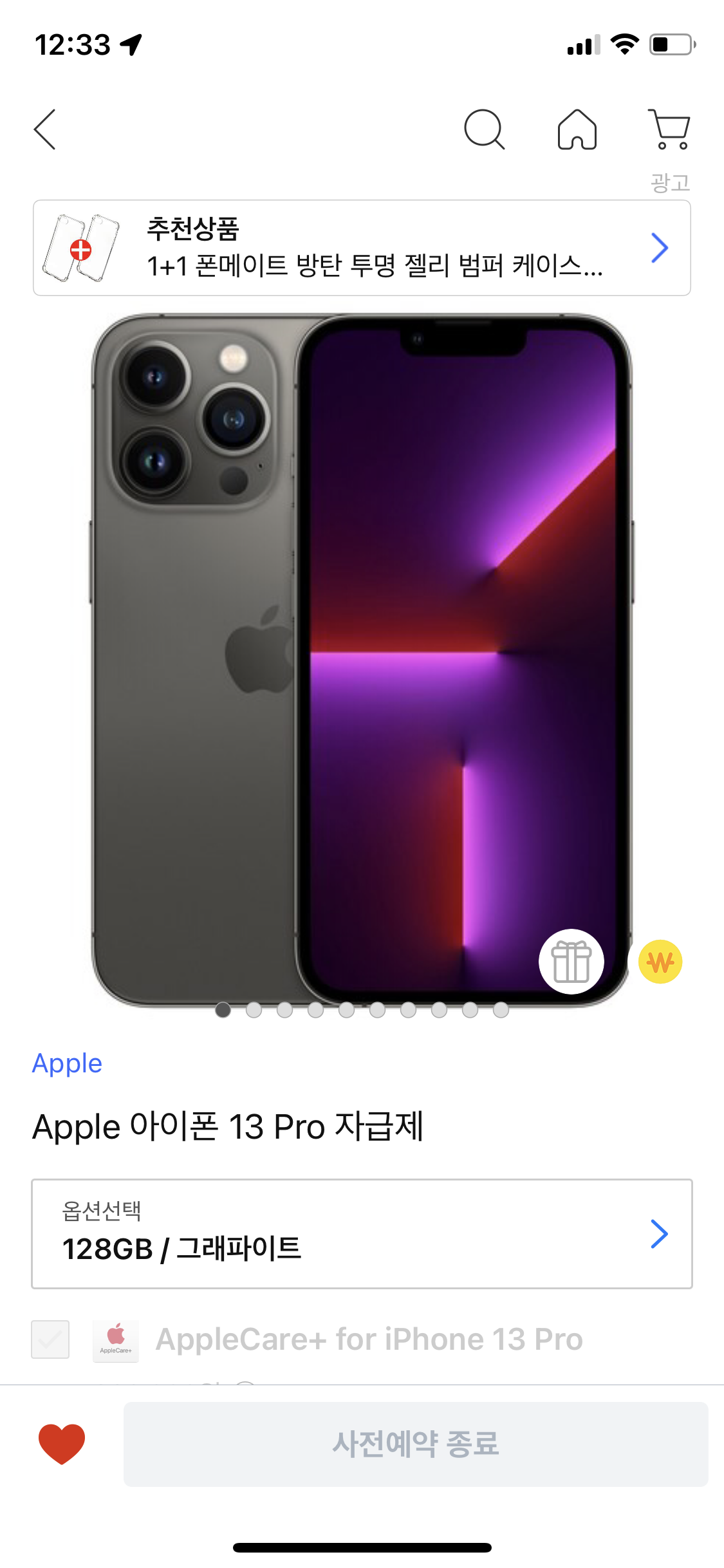 처음 구매하려던 128GB를 선택하고 주문/결제를 진행하니 흰 화면만 나오고 응답이 없더라구요..