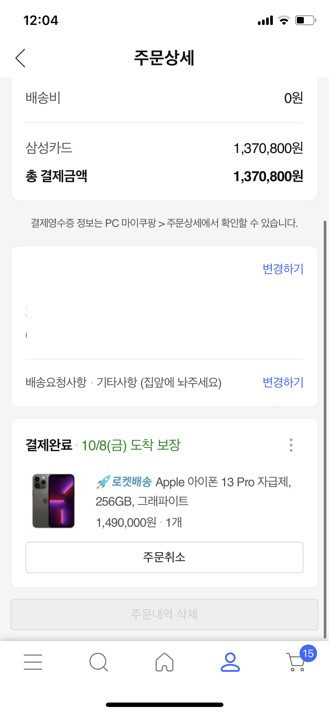 이번에 저는 "삼성카드"로 진행을 하였는데요. 이번 iPhone 13 자급제폰, 쿠팡은 8%의 할인이 적용되었습니다.